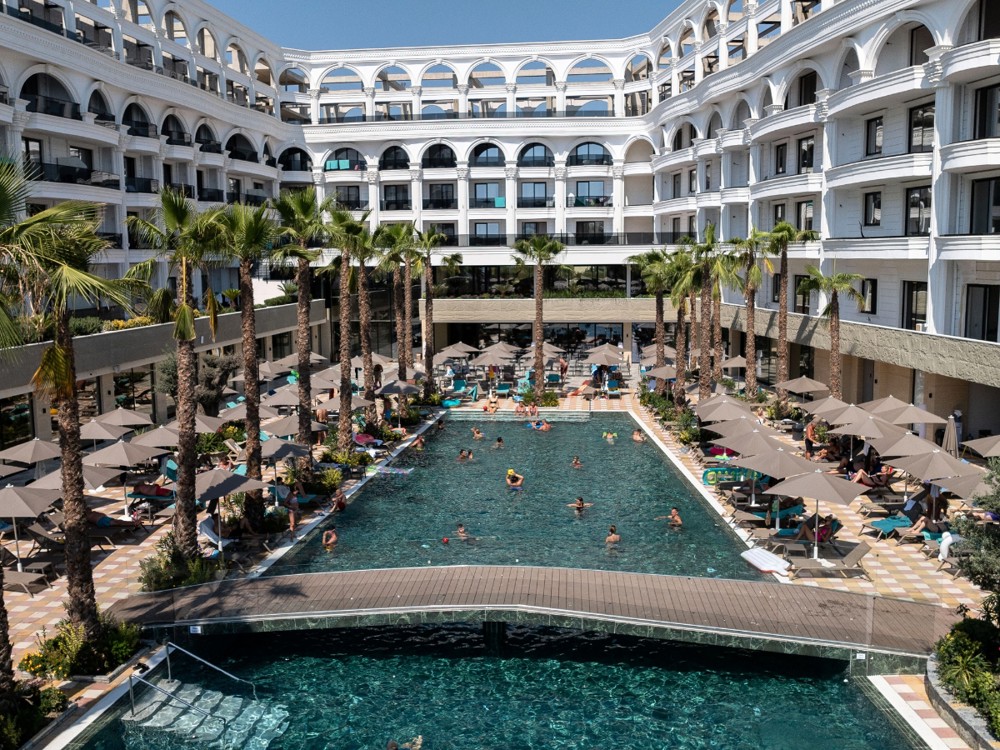 The hotel boasts modern, elegant interiors and spacious rooms with balconies, offering comfort and style throughout your stay. A standout feature is the large outdoor pool area, complete with four exciting water slides, fun for both adults and children.