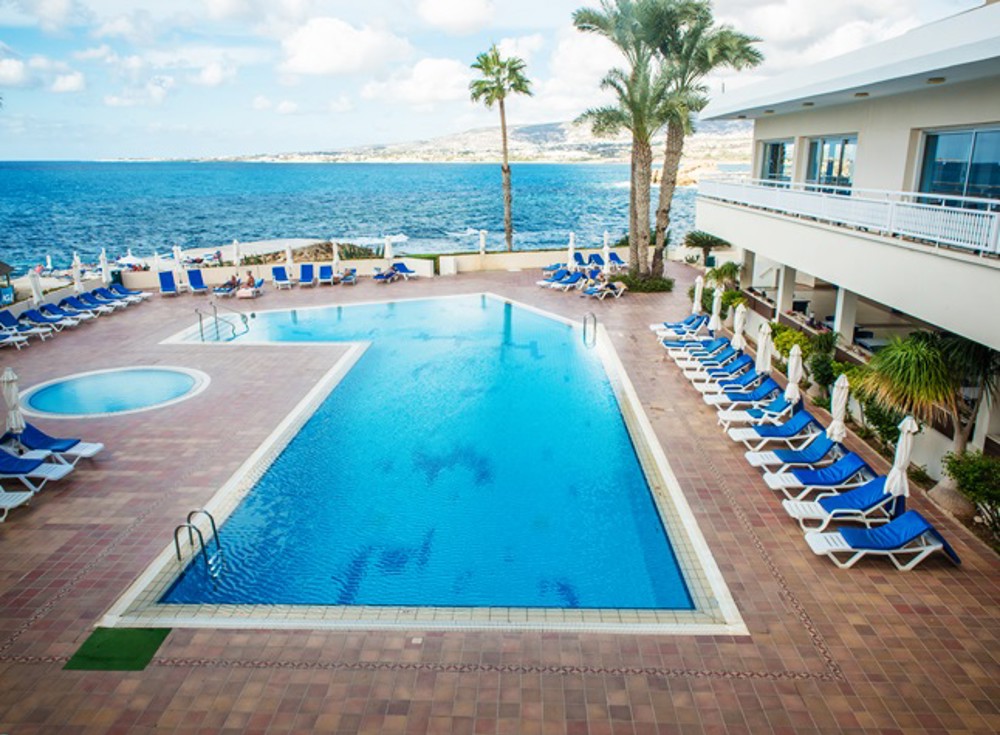 The Cynthiana Beach Hotel is situated in a delightfully secluded spot overlooking the Mediterranean. An oasis of peace and tranquillity, the Cynthiana Beach's extensive grounds offer complete seclusion amongst terraced gardens and manicured lawns. Spacious sun-terraces and sweeping lawns surround a large fresh water-pool. The coastline around the hotel is dramatically beautiful with rocky bays and the crystal clear sea. Professional, highly motivated staff will ensure attentive guest service. Only a ten minute drive from Paphos and within walking distance of local tavernas and bars, the hotel offers the chance for a peaceful and relaxing holiday.