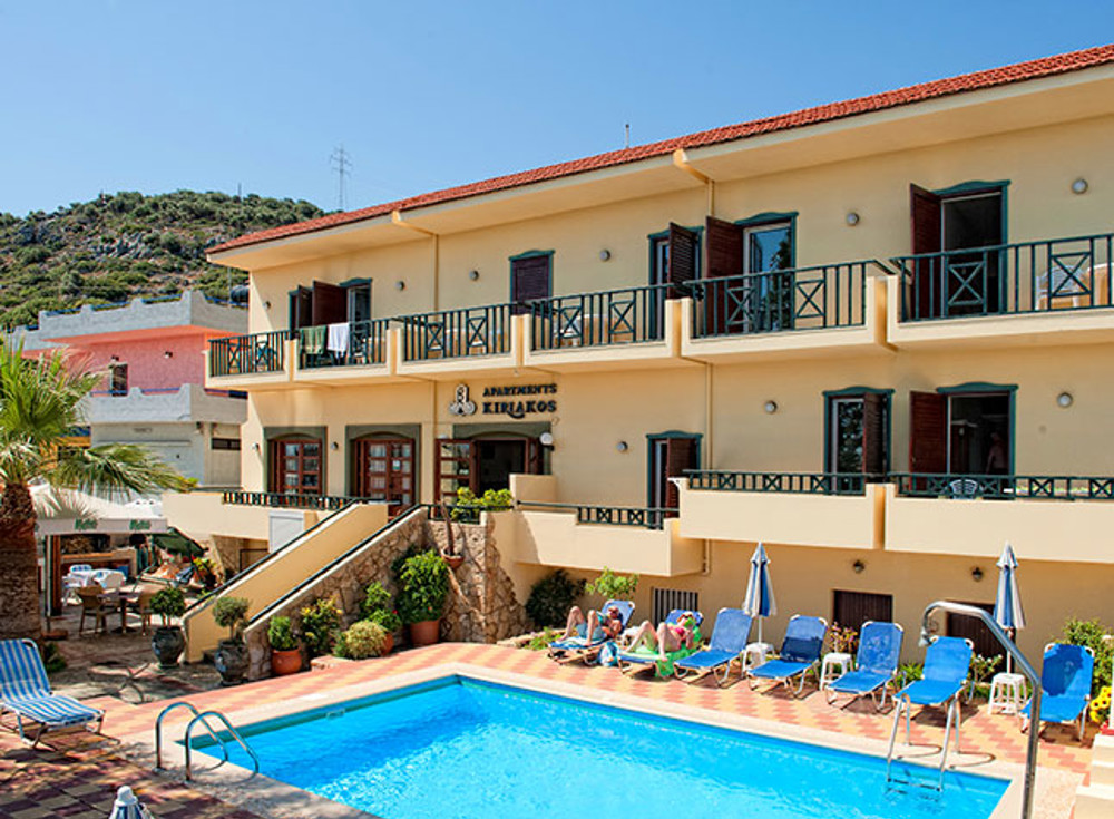 Kiriakos Apartments offer spotless and inviting accommodation in a convenient location with the lovely beach and village centre of Stalis just a short, easy walk away (150m). These family run apartments provide true local hospitality in a cosy and amicable environment. Kiriakos Apartments offer 12 well looked after, simple style studios and apartments, a swimming pool and pool side snack bar. The nearest supermarket is located just 10m away and there is a bus stop conveniently located just 20m from the hotel.