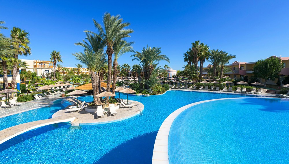 The exclusive Atrium Palace luxury villas are situated in the bay of Kalathos, 6 kilometres from the village of Lindos. These elegant villas are situated 50 metres from the beach and are beautifully furnished with locally handcrafted furniture and marble lined bathrooms. Each detached villa has its own wooden pergola leading to a private heated pool. The linked buildings of this resort have stunning views of Kalathos Bay and the surrounding coastline. Palm gardens, cascading waterfalls and sun terraces surround the split-level swimming pool, creating the atmosphere of a private oasis. The villas sleep from 2 to 6 people and guests may use all facilities at the Atrium Palace Thalasso Spa Resort.