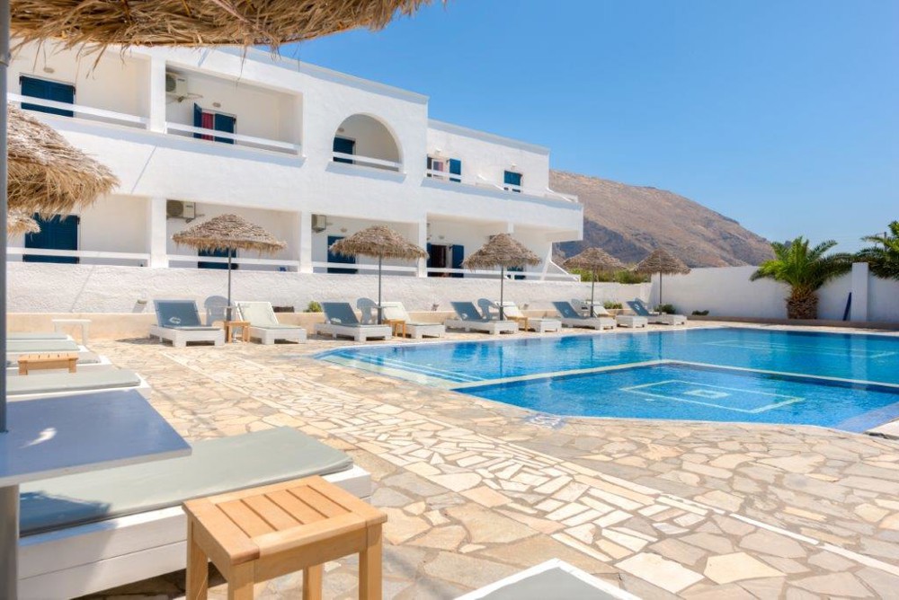 On the main road in Perissa. Traditional style well kept studios. Perissa is mainly a flat resort. 550 metres from the Sea. 10 minutes from the resort centre and 2 minutes to the nearest bus stop. Perissa has many different activities such as water sports, swimming and sunbathing and there is a good choice of nightlife with a variety of taverns, cafes, bar and beach bars on the coastal road and side streets.