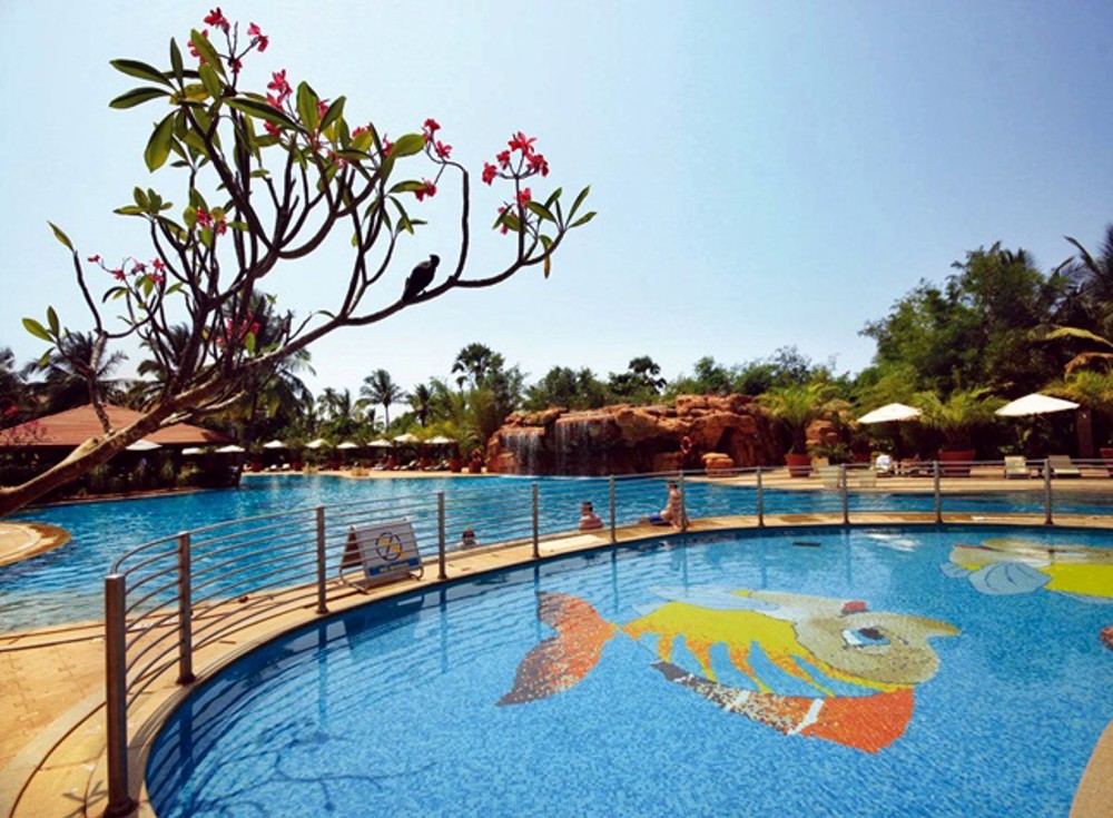 One of the best hotels on the south coast of Goa, beautifully designed on a vast, well-maintained area. Modern and simultaneously referring in décor to local traditions, it is the perfect spot for comfortable holidays and complete relaxation, it is also often chosen by organisers of conferences and weddings. The fantastic swimming pool runs in meanders like a river through the huge garden with green lawns and palm trees, has scenic wooden bridges and a waterfall in the central part. The elegant restaurant by the beach is the perfect place for a romantic dinner by a sunset. The sophisticated rooms are maintained in low-key colours and equipped with all amenities. On site a 24h casino and Ayurvedic Spa with a rich offer of massages.